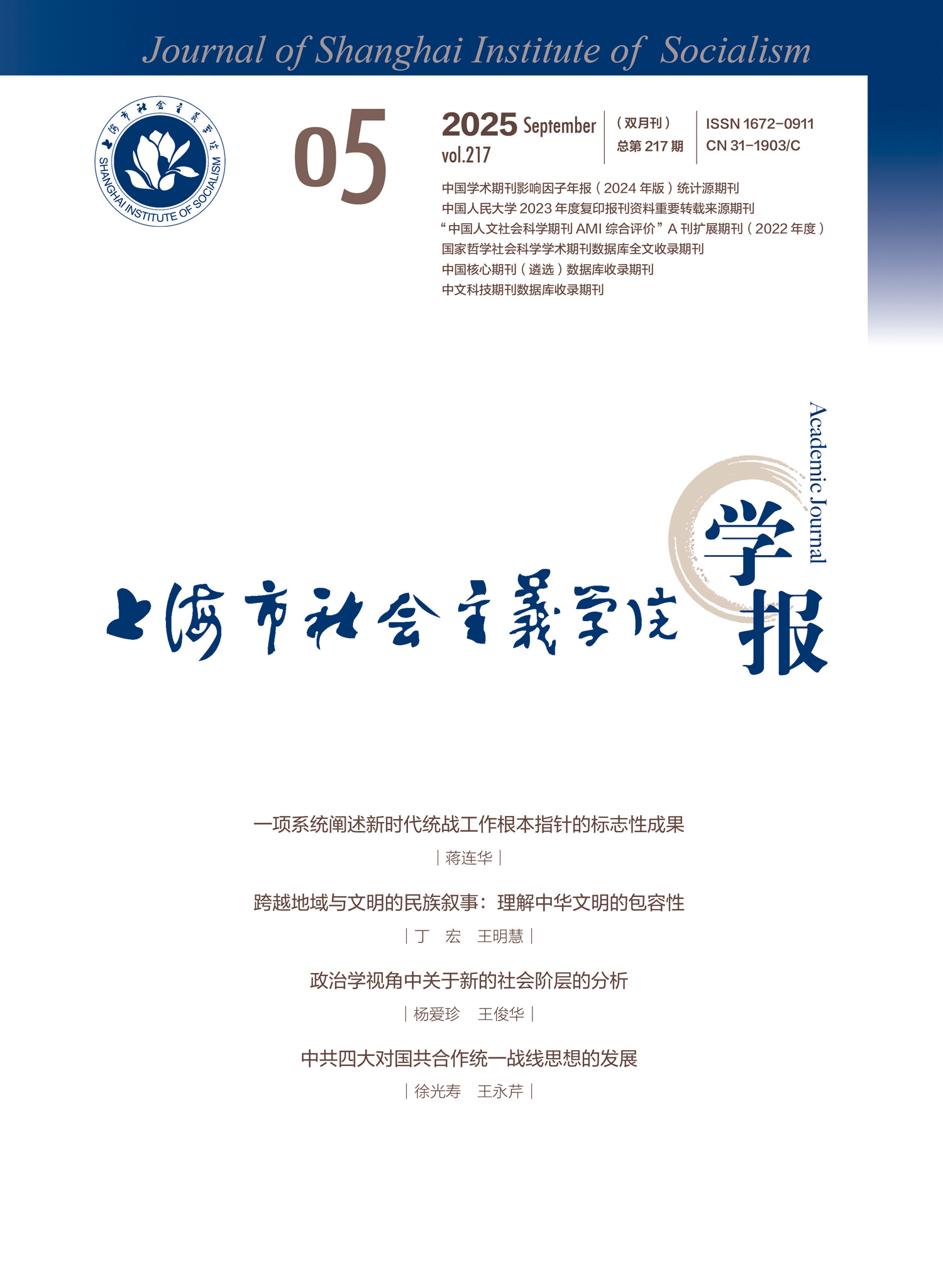 《上海市社会主义学院学报》是由上海市社会主义学院主办、上海市统战理论研究会协办的公开出版的政治类双月刊。本刊创刊于1984年,原名为《上海统战理论研究》,经国家新闻出版总署批准,于2003年1月由季刊改为双月刊并公开出版发行。本刊为中国学术期刊影响因子年报(2022年版)统计源期刊、中国人民大学2022年度复印报刊资料高转载期刊、“中国人文社会科学期刊AMI综合评价”A刊扩展期刊(2022年度)、国家哲学社会科学学术期刊数据库全文收录期刊、中国核心期刊(遴选)数据库收录期刊、中文科技期刊数据库收录期刊。